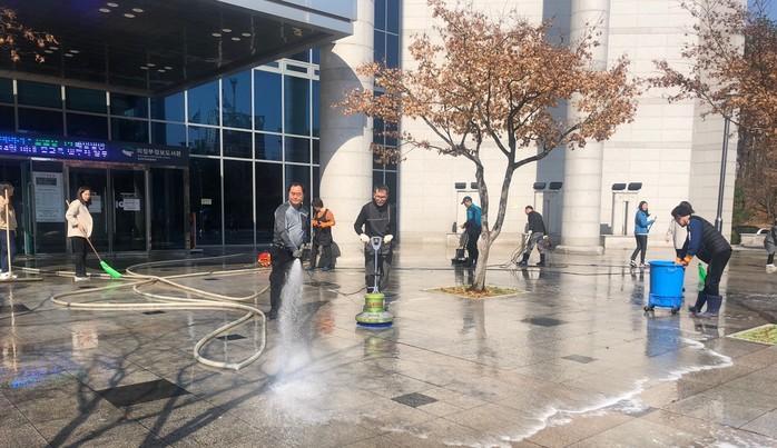 경기 의정부정보도서관·어린이도서관은 23일 각종 시설물 보수작업의 일환으로 전직원이 참여해 청사 내·외부 환경 정비를 실시했다. 코로나19 확산 방지를 위한 휴관기간 중 실시된 이번 환경 정비는 학습실 바닥 왁스 작업 및 도서관 계단 물청소 등 도서관 운영기간에 청소하기 어려운 부분에 중점을 두고 진행됐다. 사진은 관계자들이 청소를 하는 모습. (사진제공=의정부시청)