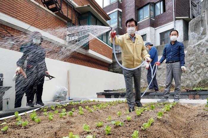 | ▲ 지난해 9월 유덕열 구청장이 답십리동에 조성한 도시 텃밭 1호에 직접 무, 상추 등을 파종하고 물을 주고 있다. (사진제공=동대문구청) |