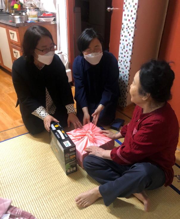 인천 서구 가정1동 지역사회보장협의체가 최근 홀몸노인 20명을 대상으로 ‘찾아가는 어르신 생신 축하 사업’을 진행해 떡 케이크와 음료를 전달하고 안부를 확인했다. 사진은 협의체 의원들이 홀몸노인 가구를 방문해 선물을 전달하고 있는 모습. (사진제공=서구청)