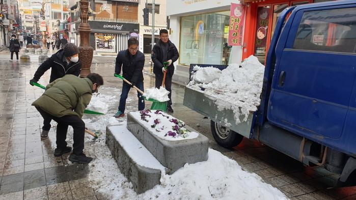 경기 이천상인회는 13일 중앙로를 이용하는 시민들의 안전을 위해 겨우내 쌓인 눈을 치우며 대청소를 실시했다. 이날 대청소는 계속된 강추위로 눈이 얼어붙자 시민들의 미끄럼 사고를 방지하기 위해 실시됐다. 사진은 상인회 회원들이 눈과 얼음을 부수고 차량을 이용해 상가 밖으로 옮기고 있는 모습. (사진제공=이천시청)