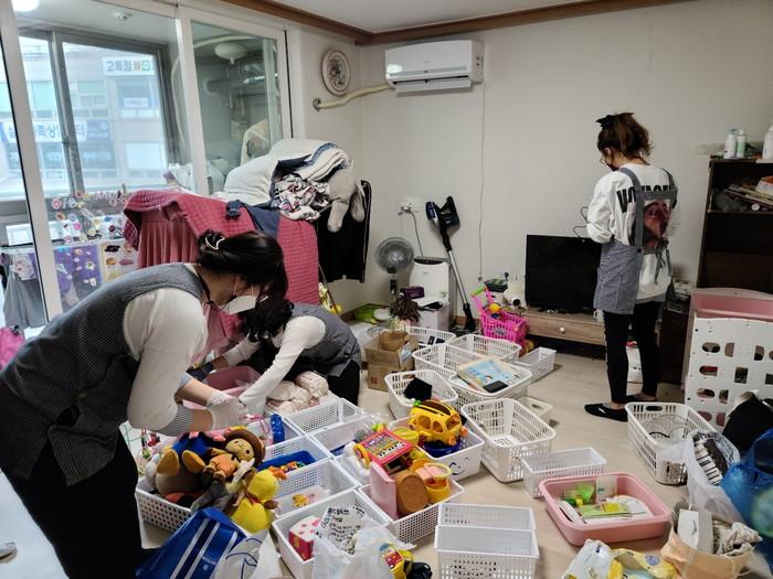 충남 아산시 온양3동 행정복지센터가 최근 한국수납정리전문가협회 충청지부의 재능기부로 고난도 사례관리 가정을 방문해 청결한 주거환경을 위한 정리수납 활동을 펼쳤다. 사진은 이날 봉사자들이 정리수납을 하고 있는 모습. (사진제공=아산시청)