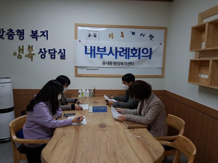 경기 동두천시 송내동 행정복지센터는 최근 지역내 치매 위기가족과 남편의 가출로 인한 한부모가족 등 신규로 발굴된 가구에 대한 효과적인 지원방법에 대해 폭 넓게 논의하고, 해결책을 모색했다. 사진은 이날 회의가 진행되고 있는 모습. (사진제공=동두천시청)