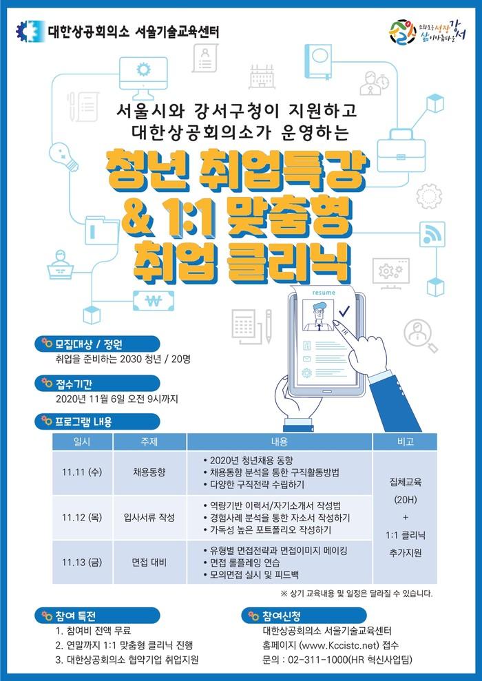 이번 취업 특강과 관련된 자세한 사항은 구청 일자리정책과 또는 대한상공회의소 서울기술교육센터로 문의하면 된다.