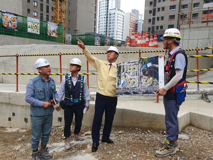| ▲ 지역내 공사장 안전점검에 참여한 유동균 구청장(왼쪽에서 세 번째)이 공사 관계자에게 안전을 당부하고 있다. (사진제공=마포구청) |