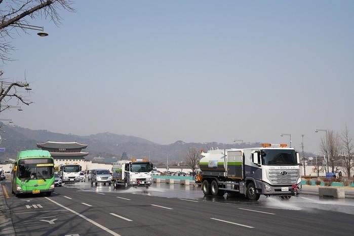 | ▲ 광화문 광장 일대를 청소하고 있는 물청소차. (사진제공=종로구청) |