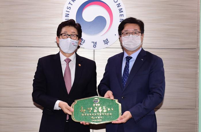 | ▲ 염태영 시장(오른쪽)과 조명래 환경부 장관이 환경교육도시 지정 현판을 들고 기념촬영을 하고 있다. (사진제공=수원시청) |