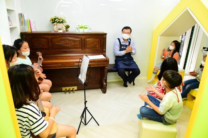 류경기 서울 중랑구청장은 최근 신내동에 위치한 우리동네키움센터 중랑1호점을 찾아 일일 돌봄교사 활동을 진행했다. 일일 돌봄교사로서 아이들에게 동화책을 읽어주고 함께 오목게임을 하는 등 4가지 미션을 했다. 사진은 류 구청장(가운데)이 어린이의 우쿨렐레 연주에 맞춰 함께 노래를 하고 모습. (사진제공=중랑구청)