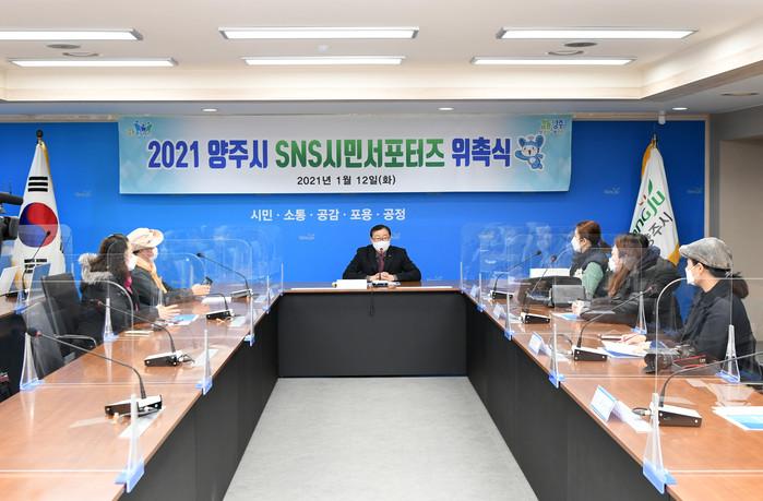경기 양주시는 지난 12일 시청 2층 상황실에서 ‘2021년 양주시 SNS 시민서포터즈’ 위촉식을 개최했다. 이날 위촉식에는 조학수 부시장, SNS 시민서포터즈, 관계 공무원 등 최소 인원만이 참석한 가운데 신규 서포터 4명을 포함한 총 10명을 위촉하고 서포터즈의 역할, 활동계획 등을 소개했다. 사진은 조 부시장(가운데)이 참여자들과 이야기를 나누고 있는 모습. (사진제공=양주시청)