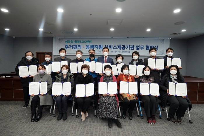 성북구가 25일 사회적기업 등 16개 기관과 ‘돌봄SOS사업 서비스제공기관 협약’을 체결했다. 협약에 따라 돌봄SOS센터가 제공하는 일시재가·단기시설·식사지원·정보상담 등 4대 기존 서비스에서 동행·주거편의 지원을 추가 확대한다. 사진은 협약식에서 이승로 구청장(뒷줄 오른쪽 다섯 번째)과 관계자들이 기념촬영을 하는 모습. (사진제공=성북구청)