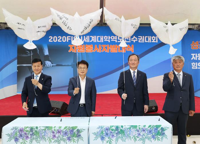2020 FISU 세계대학역도선수권대회 조직위원회가 전남 강진군 종합운동장내 역도 연습장에서 열리는 역도대회 운영을 위해 최근 조선대학교와 자원봉사 지원 업무협약 체결 및 자원봉사자 발대식을 개최했다. 사진은 이승옥 군수(왼쪽 두 번째) 및 관계자들이 성공적인 대회 개최 소망을 적은 풍선을 날리는 모습. (사진제공=강진군청)
