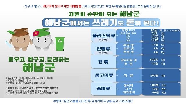 2021년 해남형 뉴딜사업으로 추진되는 이번 사업은 재활용이 가능한 제품을 가져오면 품목별로 포인트를 적립해 해남사랑상품권으로 교환해 준다.