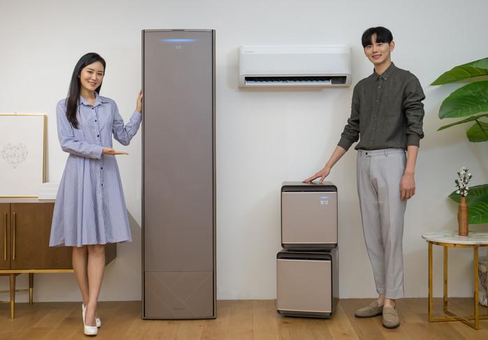 | ▲ 삼성전자 모델들이 2020년형 '무풍에어컨'과 공기청정기 '무풍큐브'를 소개하고 있다.(사진제공=삼성전자) |