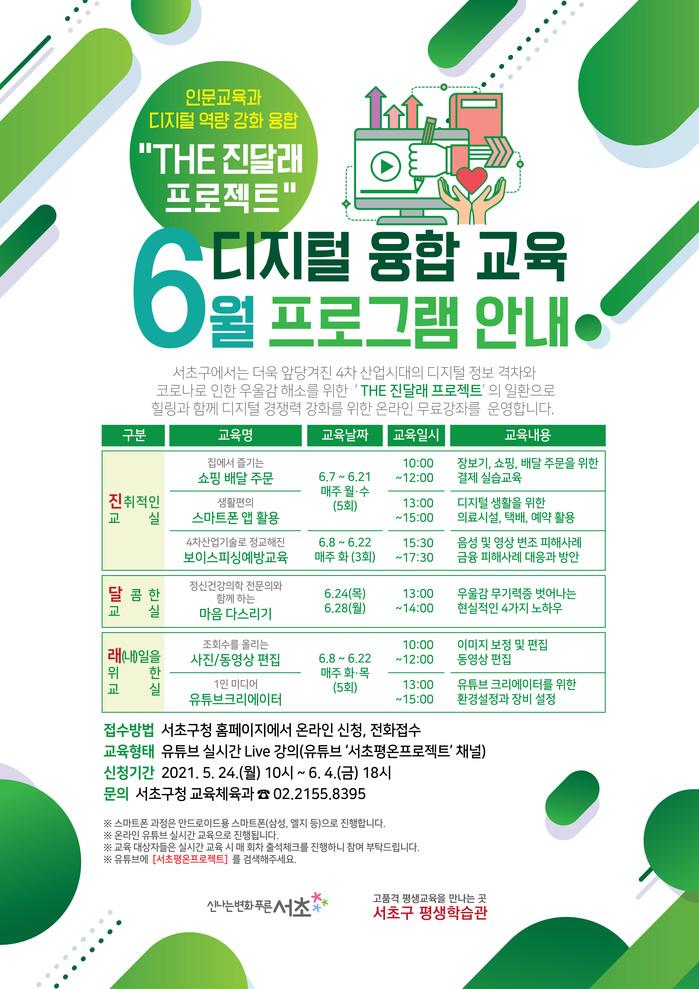 ‘The 진달래 프로젝트’는 마음 안정을 위한 힐링 인문교육을 융합한 비대면 강좌로, ▲‘진취적인 교실’ ▲‘달콤한 교실’ 그리고 ▲‘래(내)일을 위한 교실’로 구성된 서초형 디지털 융합 교육 프로젝트로, 서울시 지역특화 문해교실 공모사업에 선정돼 전액 시보조금으로 추진하는 지역특화 사업이다.