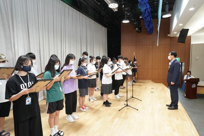 서울 성북구가 최근 '2020년 제12기 성북구 청소년 참여위원회 위촉식'을 개최했다. 이 행사에서 총 24명의 위원을 참여위원으로 위촉했다. 사진은 이승로 구청장(오른쪽)이 모든 위원에게 위촉장과 위원증을 직접 수여한 뒤 학생대표들이 다짐문을 낭독하고 있는 모습. (사진제공=성북구청)