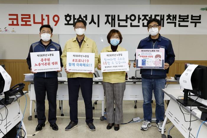 경기 화성시 공무원 노조가 오는 5월1일 제130주년 노동절을 맞이해 지역화폐 지급 행사를 연다. 노조는 조합원 1700여명을 대상으로 5만원 상당 지역화폐 총 8500만원을 지급할 계획이다. 사진은 노조 관계자들이 행사 계획을 마련하고 기념촬영을 하는 모습. (사진제공=화성시청)