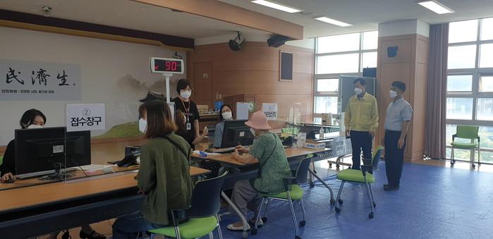 서경보 경기 수원시 권선구청장은 코로나 상생국민지원금 현장접수가 각동 행정복지센터에서 시작됨에 따라 지난 13일 지역내 행정복지센터를 방문해 오프라인 접수현장을 점검했다. 사진은 서 구청장(오른쪽 두 번째)이 원활한 지원금 지급을 위해 접수현장을 점검하고 있는 모습. (사진제공=권선구청)