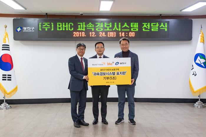 서울 광진구가 치킨 가맹업체인 (주)BHC로부터 안전한 어린이 보호구역 환경 조성을 위해 과속경보시스템 표지판 5개를 기탁받고 지난 24일 구청 기획상황실에서 ‘과속경보시스템 표지판 설치 전달식’을 했다. 사진은 김선갑 구청장(오른쪽)과 월드비전 한상호 본부장(왼쪽), (주)BHC 임금옥 대표이사(가운데)가 기념촬영을 하는 모습. (사진제공=광진구청)