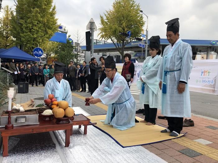 경기 수원시 권선구 세류3동 행정복지센터는 28일 음력 10월 초하루를 맞아 장승제 및 산제당 제례행사를 개최했다. 장승제 및 산제당 제례행사는 정조사거리 장승거리에서 개최하는 ‘장승제’와 수원시 향토유적 제11호인 버드내 산제당에서 개최하는 ‘당제’를 아울러 이르는 말로, 매년 음력 10월 초하루에 치러지는 마을의 공동제의 행사이다. 사진은 관계자들이 제례행사를 진행하는 모습. (사진제공=권선구청)
