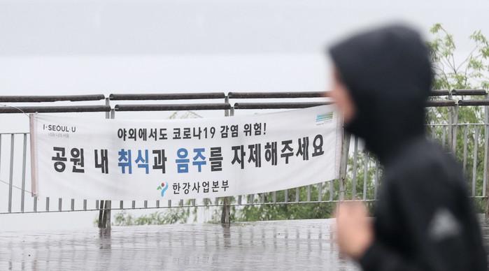 16일 오전 서울 반포한강공원에 공원 내 취식 및 음주 자제 안내문이 걸려 있다. 서울시는 지난 15일부터 10월15일까지 5개월간 보건·폭염·수방·안전 4대 분야의 '2021 여름철 종합대책'을 가동한다고 밝혔다. 특히 한강공원에서는 취식·음주 행위를 자제시키고 조기 귀가·거리두기 안전문화 캠페인을 벌일 예정이다.