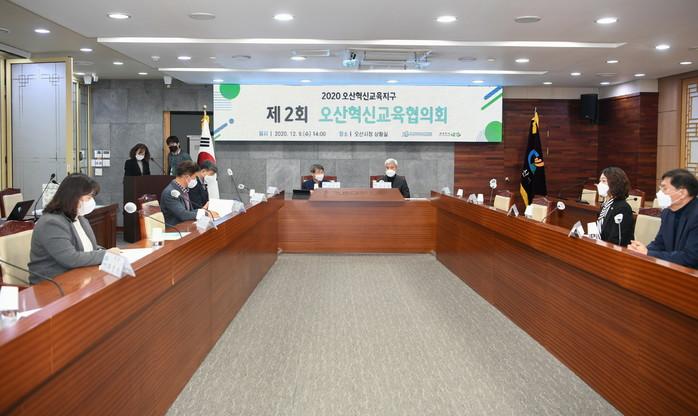 경기 오산시와 화성오산교육지원청은 지난 9일 혁신교육시즌Ⅲ 추진을 위한 ‘제2회 오산혁신교육협의회’를 개최했다. 이날 회의에서는 올해 교육사업과 오는 2021년부터 시작되는 혁신교육시즌 Ⅲ의 추진 비전과 방향 등 중요 사항을 공유하고 발전방안을 모색했다. 사진은 곽상욱 시장(가운데 오른쪽)이 회의를 주재하고 있는 모습. (사진제공=오산시청)