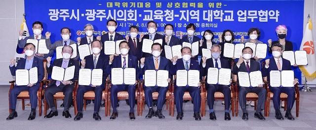 광주광역시는 8일 시청 중회의실에서 광주시의회, 광주시교육청, 광주지역 대학들이 참석한 가운데 지역대학 위기대응 및 대학발전 상호협력을 위한 업무협약을 체결했다.
