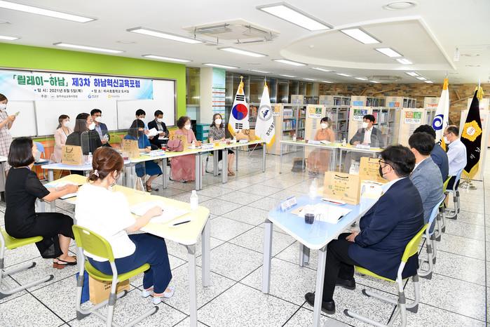 경기 하남시가 지역 교육 현안 발전방향 논의를 위해 최근 광주하남교육지원청과 함께 미사초등학교에서 '제3회 하남혁신교육포럼 기획위원회'를 개최했다. 이날 김상호 시장과 기획위원 등은 ▲제2회 혁신교육포럼 결과 보고 ▲올해 상반기 혁신교육지구사업 운영 전반에 대한 교육공동체 의견수렴 결과 ▲내년도 혁신교육지구 사업 운영계획을 주제로 논의를 진행했다. 사진은 김 시장과 위원들이 논의를 하고 있는 모습. (사진제공=하남시청)