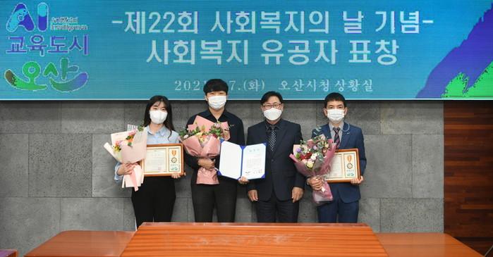 경기 오산시가 7일 제22회 사회복지의 날을 맞아 시 유튜브 채널을 통해 온라인 기념식을 개최했다. 이날 기념식에서는 나눔문화 확산을 위해 복지체험키트를 배부하고 나눔봉투 및 온라인콘텐츠를 활용한 모금 등을 진행했으며, 모금된 후원금품은 추석 전 저소득가구에 배부될 예정이다. 사진은 기념식에서 사회복지 유공자 표창 후 관계자들이 기념촬영을 하고 있는 모습. (사진제공=오산시청)