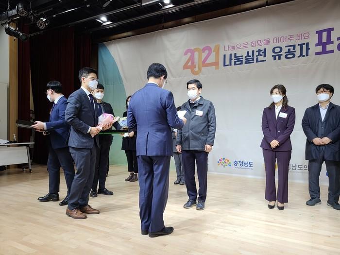 충남 홍성군은 28일 열린 ‘2021 나눔실천 유공자 포상식’에서 나눔실천 우수시군(캠페인)으로 선정돼 도지사상을 받았다. 군은 코로나19 위기 상황에서도 군민들이 기부에 적극적이고 자발적으로 참여해 사랑의 온도를 높인 결과라고 밝혔다. 사진은 시상식에서 우수기관상을 받고 있는 복성진 복지정책과장(가운데)의 모습. (사진제공=홍성군청)