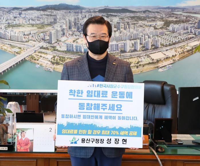 성장현 서울 용산구청장이 8일 코로나19로 어려움을 겪는 소상공인들을 지원하기 위한 ‘착한 임대료 확산 챌린지’에 동참했다. 사진은 성 구청장이 챌린지에 참여하고 있는 모습. (사진제공=용산구청)