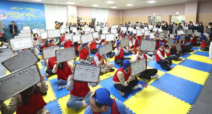 서울 영등포구는 청렴 문화를 확산하기 위해 최근 구청 별관에서 직원 110여명을 대상으로 ‘도전! 청렴 골든벨’을 개최했다. 이날 골든벨에서는 청탁금지법, 공무원 행동강령 등에 대한 문제가 출제됐다. 사진은 답안을 들고 있는 모습. (사진제공=영등포구청)