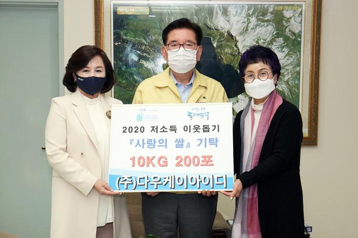 서울 동대문구는 26일 ㈜다우케이아이디로부터 '저소득 이웃돕기 사랑의 쌀' 2000kg을 기탁받았다. 사진은 유덕열 구청장(가운데)이 관계자들과 기념촬영을 하고 있는 모습. (사진제공=동대문구청)