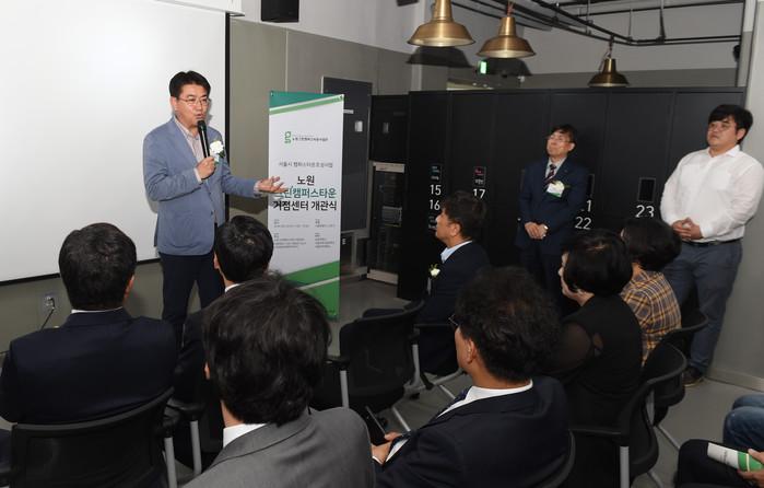 노원구는 25일 노원공릉공공행복주택 지하 1층 및 1층 커뮤니티센터에서 ‘노원그린캠퍼스타운’을 개소했다. 이 센터는 청년 일자리 창출을 위해 조성됐다. 사진은 개관식에 참석한 오승록 구청장이 기념사를 전하는 모습. (사진제공=노원구청)