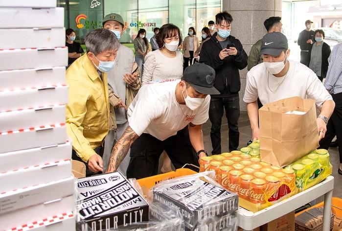 서울 용산구 이태원 상인모임이 코로나19 극복을 위해 힘쓰고 있는 구 선별진료소 의료진 및 직원들을 응원하기 위해 최근 용산복지재단에 도시락 200인분을 기부했다. 사진은 상인모임 관계자들이 도시락을 옮기고 있는 모습. (사진제공=용산구청)