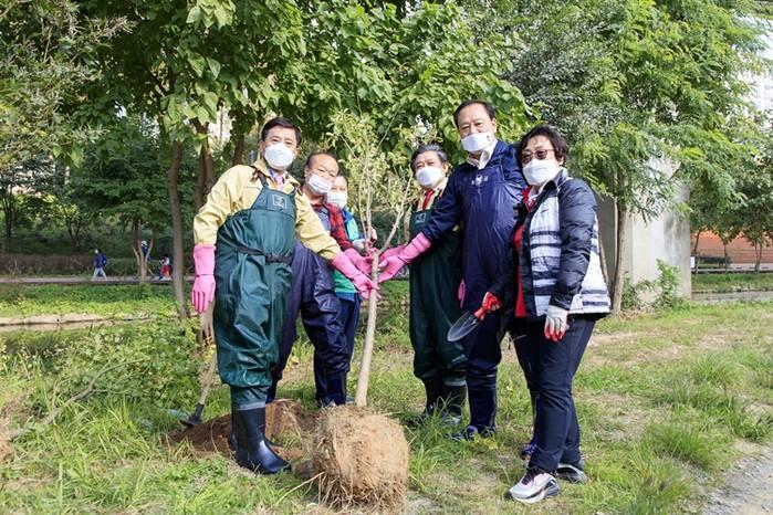 유동균 서울 마포구청장이 지난 27일 새마을운동 마포구지회와 함께 홍제천 정화활동에 나서 하천변 제초 작업, EM 흙공 던지기 등과 ‘나무 500만 그루 심기’ 사업의 일환으로 홍제천 주변 수목을 식재했다. 사진은 유 구청장(오른쪽에서 두 번째)이 홍제천 변에 나무를 심고 있는 모습.(사진제공=마포구청)