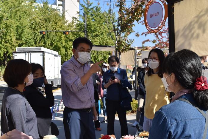 오승록 노원구청장이 최근 경춘선 숲길 방문자 센터 주변에서 열린 프리마켓인 '추추마켓'에 참석했다. 추추마켓은 일반주민 및 학생들이 순수 창작 수공예품을 전시·판매할 수 있는 기회를 마련해 일자리와 창업의 발판을 제공하고자 마련됐다. 사진은 오승록 구청장(가운데)이 추추마켓에 참석해 판매자와 이야기를 하고 있는 모습. (사진제공=노원구청)