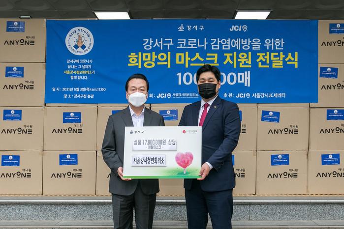 서울 강서구는 3일 강서청년회의소로부터 이웃돕기 성품 덴탈마스크 10만장을 전달받았다. 이 성품은 기초생활수급자·홀몸노인 등 지역내 어려운 이웃과 사회복지시설에 전달된다. 사진은 전달식에서 노현송 구청장(왼쪽)이 관계자와 기념촬영을 하고 있는 모습. (사진제공=강서구청)