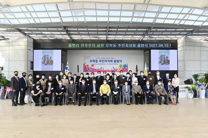 경기 여주시 오학동 주민자치회 출범식이 최근 신륵사 야외대공연장에서 열렸다. 이날 행사는 주민자치회 위원 33명에 대한 위촉장 수여와 출범 선언 등으로 진행됐다. 사진은 이날 이항진 시장(앞줄 가운데)과 관계자들이 기념촬영을 하고 있는 모습. (사진제공=여주시청)
