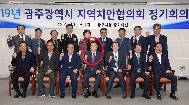 [광주=정찬남 기자] 이용섭 광주광역시장(앞줄 가운데)이 8일 오전 시청 3층 중회의실에서 법질서 확립에 대한 공감대 형성과 안전한 지역사회 조성을 위해 열린 ‘지역치안협의회’ 후 참석자들과 함께 기념촬영을 하고 있다./광주광역시 제공