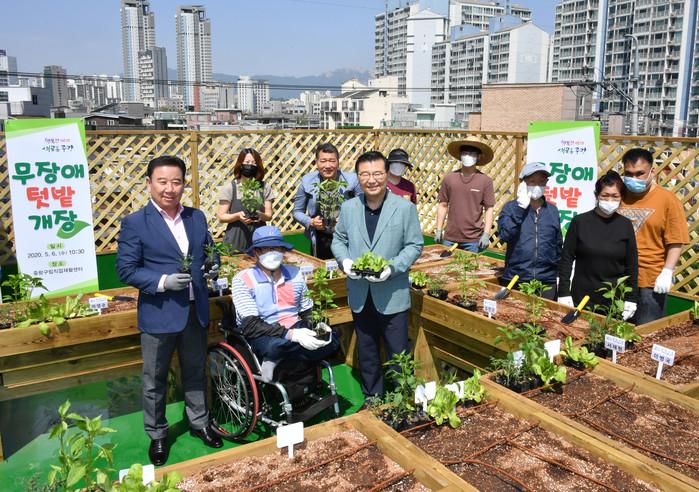서울 중랑구가 최근 장애인과 비장애인이 함께 사용할 수 있는 ‘무장애 텃밭’을 중랑구립직업재활센터 옥상에 개장했다. 사진은 무장애 텃밭 개장식에 참석한 류경기 구청장(왼쪽에서 세번째)과 주민들이 기념촬영을 하는 모습. (사진제공=중랑구청)