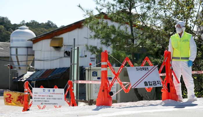 김포에서 아프리카돼지열병(ASF) 의심 신고가 접수된 23일 오전, 신고가 접수된 경기 김포시 통진읍 한 양돈농장 앞에서 방역당국 관계자가 외부인 출입을 통제하고 있다.