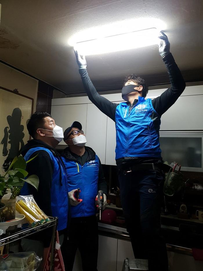 한국자유총연맹 경기 하남시지회는 최근 저소득층 중증장애인 3가정을 대상으로 노후된 조명을 LED등으로 교체해 주는 '사랑의 등 달아주기' 봉사를 진행했다. 사진은 이날 청년회 회원들이 노후된 조명을 LED조명으로 교체하고 있는 모습. (사진제공=하남시청)