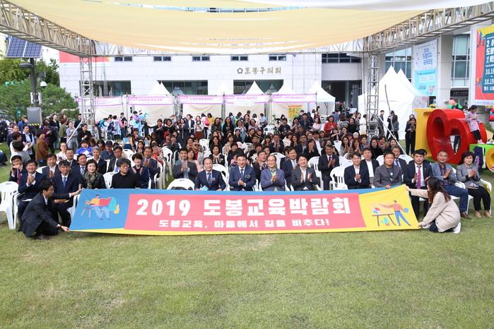 서울 도봉구는 최근 구청 광장에서 ‘2019 도봉교육 박람회’ 개막식을 개최했다. 이번 박람회는 ‘도봉 교육, 마을에서 길을 비추다’라는 슬로건 아래 열렸다. 사진은 박람회에 참석한 이동진 구청장과 참석자들이 기념촬영을 하는 모습. (사진제공=도봉구청)