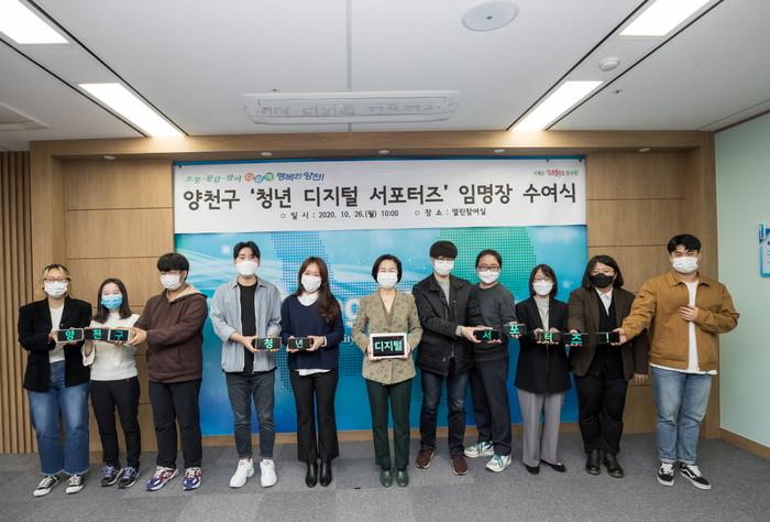 서울 양천구는 26일 지역내 소상공인 대상 디지털전환 지원교육·지원사업 수요조사 등 찾아가는 서비스를 수행할 '디지털 서포터즈'를 임명했다. 사진은 임명장 수여식에서 청년들과 김수영 구청장(가운데)이 스마트 기기 화면에 ‘양천구 디지털 서포터즈’ 문구를 띄우고 기념사진을 찍고 있는 모습. (사진제공=양천구청)