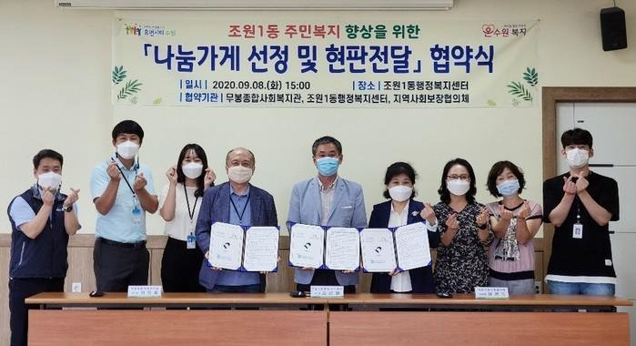 경기 수원시 장안구 조원1동은 8일 무봉종합사회복지관, 지역사회보장협의체와 함께 지역내 주민복지 향상을 위한 '나눔가게 선정 및 현판 전달' 협약을 체결했다. 이번 협약으로 기부와 나눔을 실천하고 있는 지역복지 모범업소를 나눔가게로 선정해 현판을 부착한다. 사진은 관계자들이 기념촬영을 하는 모습. (사진제공=장안구청)