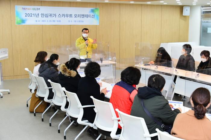 중랑구가 지난 23일 2021년 안심귀가스카우트 오리엔테이션을 개최했다. 대원들은 면목역 등 11곳을 중심으로 늦은 시간 여성·청소년이 안전하게 귀가할 수 있도록 돕고 유흥업소 인근 등 안전취약지역과 학원가를 집중 순찰한다. 사진은 오리엔테이션에서 류경기 구청장이 격려인사를 전하는 모습. (사진제공=중랑구청)