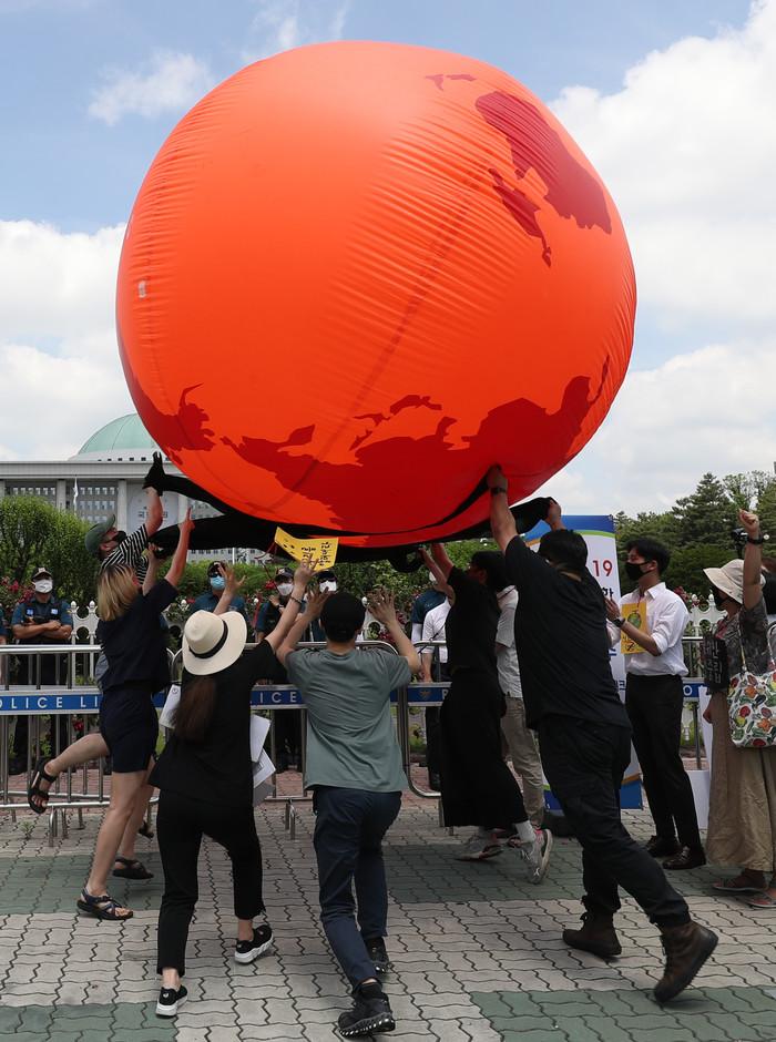 기후위기 비상행동 회원들이 11일 서울 여의도 국회 앞에서 열린 '기후위기 시한폭탄, 21대 국회에서 멈춰라' 기자회견에서 기후위기비상선언 결의안 채택과 기후재난 대응 정책 우선 추진을 촉구하는 퍼포먼스를 벌이고 있다.
