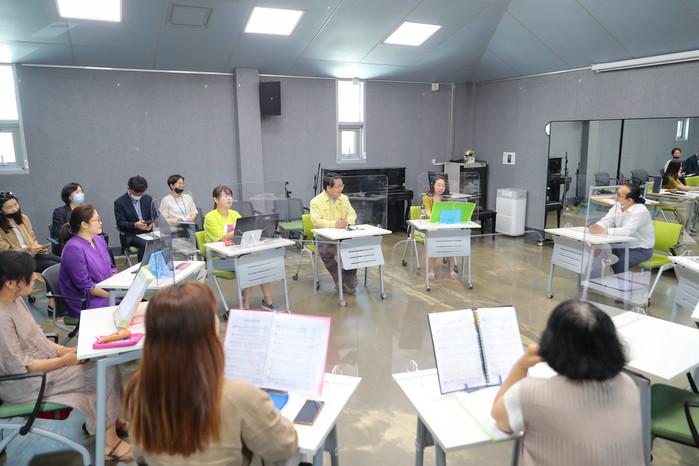 오세현 충남 아산시장이 최근 코로나19 안전수칙 하에서 문화활동을 이어가는 '1인 1악기 동아리' 활동 현장을 방문해 강사와 시민들의 의견을 듣고 코로나 안전수칙 준수 협조를 당부했다. 사진은 배방생활문화센터 오카리나 동아리 '작은거위' 회원들과 이야기를 나누는 오 시장의 모습. (사진제공=아산시청)