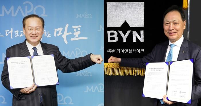 서울 마포구가 최근 (주)비와이엔블랙야크와 투명 페트병 재활용 활성화사업 확대를 위한 업무협약을 체결했다. 구는 지역내 고품질 투명 페트병의 물량을 확보하고, 블랙야크는 수거된 투명 페트병으로 ‘K-rPET 재생섬유’를 생산해 의류 등을 제작한다. 사진은 협약식에서 유동균 구청장(왼쪽)과 강태선 회장이 기념촬영을 하는 모습. (사진제공=마포구청)