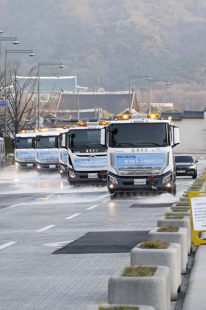 25일 오전 서울 종로구 세종대로에서 종로구청이 준비한 물청소 차량이 운행되고 있다.