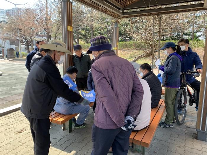 인천 부평구는 오는 19일까지 지역내 공원에서 사회적 거리두기 캠페인을 전개, 봄철 공원 이용객들을 대상으로 사회적 거리두기 집중 계도를 하며 안전한 공원 환경 조성에 나선다. 사진은 공원 이용객들에게 홍보 전단지를 배부하는 모습. (사진제공=부평구청)
